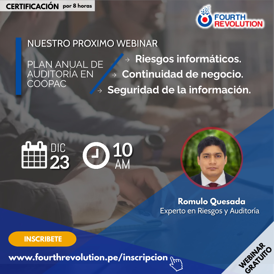 Webinar dirigido a auditores internos, jefes de auditoría e integrantes del Consejo de Vigilancia de Cooperativas de Ahorro y Crédito reguladas por la Superintendencia de Banca, Seguros y AFP. La capacitación tiene como finalidad brindar conocimientos para una adecuada planificación de actividades de control relacionadas a riesgos informáticos, sistema de gestión de seguridad de la información y sistema de gestión de continuidad de negocio, como parte del Plan Anual de Auditoría. |